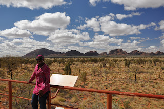 We spent the afternoon on a group tour to "The Olgas", or Mount Olga, which are a large group of rock formations known as "Kata Tjuta" (the traditional aboriginal name). Our guide was a local aboriginal (similar to Native Americans in the US) who told us the history of the local aboriginal tribes, their customs, the general stories about the land (the details are kept a secret within the tribes), and how and why the lands were sacred. From a distance The Olgas looked like a row of large gumdrop-like rocks. Up close the "rocks" extend a couple of thousand feet into the air.